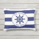 Dieses Kissen mit dem Namen Ihres Bootes und dem Jahr der Einrichtung ist für Sie persönlich. Das Design ist mit einem marineblauen Kapitän-Rad mit einem kreisrunden Seilstreifen versehen. Der Hintergrund ist blau-weiße Streifen. Die Rückseite des Kissens ist marineblau.