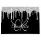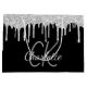 Ein klassischer schwarzer Hintergrund mit Imitats silberne Glitzer Tropfen, Farbe Tropflook. Personalisieren und fügen Sie einen Namen und Monogramm-Initialen hinzu. Der Name ist mit einem modernen handgeschriebenen Stilskript geschrieben. Weiße und graue Buchstaben. Ideal für Geburtstage, Brautparty, Babydusche.