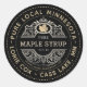 Passen Sie dieses Label mit Ihrem Staat-Namen in kurvigem Text an der Spitze dieses Labels an. Verziertes, elegantes Rundschwarzes, lokales Ahornsirup-Etikett mit den Worten in einem "geprägten" vergoldeten Schriftart. gestrichelte Linie in einem gedämpften Gold. Ihr Name und Ort in kurvigem Text entlang des unteren Teils des Labels.