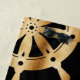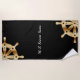 Ein stilvoller schwarzer Hintergrund. Dekoriert mit einem Teil von 2 Imitaten goldenen Lenkrädern. Personalisieren Sie den Namen des Bootes und fügen Sie ihn hinzu.