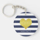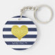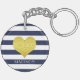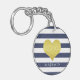 Schlüsselkette mit einem goldenen Imitat-Folienherz auf einem blau-weiß gestreiften Muster und personalisiertem Namensdruck.
