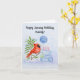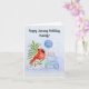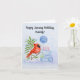 This hand-painted watercolor design features a bright red cardinal perched on a winter branch, holding a snowflake balloon and sitting beside a January birthday cake decorated with white and purple carnations—the traditional flowers for January.