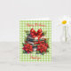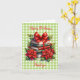 Eine personalisierte Merry Bookmas Karte mit einem schönen Stapel von Aquarellbüchern, einem großen roten Band und Poinsettias gegen einen grünen Gingham. Eine einzigartige Weihnachtskarte für Buchwürmer, Mitglieder des Buchclubs und vieles mehr.
