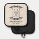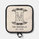 Mit diesem eleganten Topf-Halter können Sie Ihre Küchendekoration mit einer Touch persönlicher Geschichte verbessern. Mit einer schicken antiken filigranen Schriftrolle, dem Monogramm Ihrer Familie und dem Datum der Gründung in einem schwarzen Typografie-Stil auf einem cremefarbenen Elfenbeinhintergrund, ist es nicht nur praktisch für den Umgang mit heißen Geschirr, sondern dient auch als personalisiertes Kunstwerk, das etwas Eleganz in Ihre Zuhause bringt.