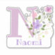 Personalisieren Sie jedes Element mit einem Namen und Initial mit einem Blumen-Design-Ausschneidungs-Sticker. Beispielname ist Naomi.