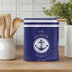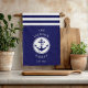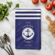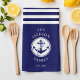 Nautische Themen marineblau-weiß gestreiftes Küchenhandtuch mit einem nautischen Anker und personalisierten Familiennamen in der Mitte. Personalisieren Sie es mit Ihren eigenen Familiendetails.