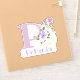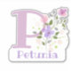Personalisieren Sie jedes Element mit einem Namen und Initial mit einem Blumen-Design-Ausschneidungs-Sticker. Beispielname ist Petunia.
