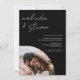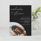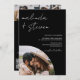 Moderne, schicke und elegante Hochzeitseinladung mit Bogen, Schriftnamen mit handgeschriebener Kalligraphie in Schwarz und Weiß mit einem gewölbten Foto und weiteren 3 Fotos hinten. Modernes Ganzes in einer Hochzeitseinladung mit uAwg, Details , Unterkünften und qr Code. Alle Texte, Namen und Hintergrundfarben sind anpassbar. Eine einfache und minimalistische Einladung.