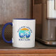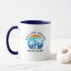 Willkommen an Bord Bootsname Summer Palm Trees Sunset Retro Stil Coffee Tasse. Navy Blauer Text oder wählen Sie Ihre Farbe. Zwei Tone Blau und Weiß.