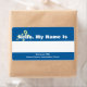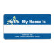 Individuelle Name Tags mit gelber Blume auf blauem Hintergrund. Der weiße Streifen zum Schreiben von Namen. Ändern Sie den unteren Text, um den Namen Ihrer Gruppe und des Ereignisses anzuzeigen.