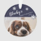Niedlicher Erster Welpen Weihnachtsname und Foto Ornament. Der Hintergrund ist dunkelblau und der Text ist in trendiger weißer Typografie gehalten. Personalisieren Sie das Ornament mit dem Foto, dem Namen und dem Geburtsjahr Ihres Hundes - geben Sie Ihr Lieblings-WelpenFoto ein. Sie können dieses maßgeschneiderte Ornament für jedes Haustier verwenden. Ein toller Urlaubssake für Sie oder ein Geschenk für Ihre Familie und Freunde.