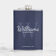 Fügen Sie Ihrer Hochzeit eine persönliche Touch mit personalisierten Trauzeugen Flasche. Dieser Kolben zeigt den Namen des personalisierten Trauzeugen im Schriftart-Stil mit weißen klassischen Schriftzeichen, mit Hochzeitsdetails im klassischen Serifenstil und Monogramm im hellblau-klassischen Serifenstil als Hintergrund auf marinebasischem Schriftart. Auch perfekt für Trauzeuge, Brautvater und mehr.