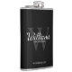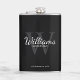 Fügen Sie Ihrer Hochzeit eine persönliche Touch mit personalisierten Trauzeugen Flasche. Dieser Kolben weist den Namen des personalisierten Trauzeugen im Stil eines klassischen Schriftartes mit weißer Schrift auf, mit Hochzeitsdetails im klassischen Serifenstil und Monogramm im hellgrauen Schriftart-Stil, als Hintergrund, auf schwarzem Hintergrund. Auch perfekt für Trauzeuge, Brautvater und mehr.