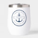 Thermalwäscher mit einem Anker mit einem Bandbanner und individualisierbarem Titel. Fügen Sie oben Ihren Namen und unten Ihren Bootsnamen hinzu. Um den Anker und den Text ist ein runder Seilstreifen. Dunkelblaues Design auf weißem Hintergrund.