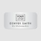 Namensschild mit Ihrem Namen, Titel und eigenem Logo auf einem satingrauen Farbverlauf. Mit dem Designwerkzeug können Sie Schriftart ändern, das Logo verschieben und verändern.