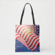 This vibrant patriotic design features a waving abstract American flag background, accented by festive fireworks and stars. The modern white name is placed up a ways on the bag, any lower would be printed too close to the bottom (see mockup pics). The reverse side features a solid color taken from the front and a short quote with ample room for rows of text to make it yours. Change or remove text, font, color and size... using the Template provided. Dimensions are 16" x 16" with a 28" black strap; an 18" bag is also offered. The exterior is 100% sturdy brushed polyester; interior is 100% polyester nonwoven laminate. Printed and then sewn for edge-to-edge designs. Made in the USA.
