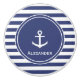 Ein weißer Bootsanker befindet sich in der Mitte eines dunkelblauen Kreises. Der Hintergrund ist ein dunkelblau-weiß gestreiftes Muster. Personalisieren Sie Ihre Namen unter dem Anker im weißen Text.