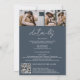 Moderne, schicke und elegante Hochzeitseinladung mit Skriptnamen mit handgeschriebener Kalligraphie in staubblau und weiß mit einem schwarzen Overlay vorne, um Ihr Foto und weitere 3 Fotos hinten hinzuzufügen. Modernes Ganzes in einer Hochzeitseinladung mit uAwg, Details , Unterkünften und qr Code. Alle Texte, Namen und Hintergrundfarben sind anpassbar. Eine einfache und minimalistische Einladung.