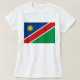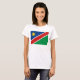 Die Vorderseite dieses T - Shirt zeigt mutig die namibische Fahne mit ihrer markanten gelben Sonne auf blauem Dreieck, fimbrierten roten Diagonalen und grünen Dreieck. Hinter dem Bild befindet sich eine attraktive Karte Namibias.