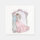 Illustration eines Ehepaares, das unter einem Blumenbogen küsst, der Mann ist weiß, 28 Jahre alt, mit braunem Haar, einem hellblauen Anzug und einer weißen Hose, die Frau ist weiß, 25 Jahre alt, blondes Haar, ein langes rosa Kleid mit Blumendetails, der Bogen ist mit rosa und weißen Rosen und grünen Blätter geschmückt kühne Konturen und sanfte Farben.