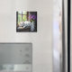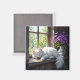 Add a relaxing vibe to your frig with this pretty colorful magnet featuring a white fluffy cat napping on a rustic window sill next to a pretty vase of vibrant purple flowers.