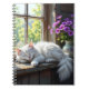 Add a relaxing vibe to your office or school supplies with this pretty colorful notebook featuring a white fluffy cat napping on a rustic window sill next to a pretty vase of vibrant purple flowers.