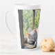 Add a relaxing vibe to beverage collection with this pretty colorful coffee mug featuring a white fluffy cat napping on a rustic window sill next to a pretty vase of vibrant purple flowers. Add your name in the personalize area.