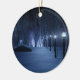 Ein schneebedeckter Weg, der sich in einer dunklen Winternacht durch den Birkenwald schlängelt. Der Weg ist von Laternenpfählen gesäumt, die ein silberblaues Glühen verleihen, aber im Schatten sind die Formen, wie kleine Lichter aus Märchen, hell und verleihen dem Reisenden den Weg. In der Ferne leuchtet der Lavendel einer geheimnisvollen Ansammlung des Waldes den kalten Himmel.