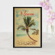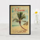 Ein einzigartiges Retrodesign aus der Mitte des Jahrhunderts im Stil eines Vintage-Reiseplakats. Es verfügt über eine geschwungene Palme am Sandstrand mit Ozean unter einem blauen bewölkten Himmel.