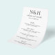 Modernes Hochzeitsmenü (auf dünnem Druckerpapier gedruckt) mit einem einfachen und minimalen Schwarz-Weiß-Design mit dem Monogramm in einem fett gedruckten Schriftart und Ihren Namen in einem eleganten Schriftzeichen.