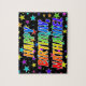 This vibrant, fun, birthday-themed jigsaw puzzle design has the message "HAPPY BIRTHDAY, NATHANIEL" with the characters having a colorful rainbow spectrum inspiriert gradient pattern, along with an exciting stars background pattern. A colorful puzzle like this might be used to send birthday wishes to somebody named Nathaniel. [~ Z0000468]