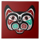 Dekorieren Sie Ihr Zimmer mit dieser Kachel mit einer niedlichen Haida Kitty aus British Columbia, Kanada. Die Hintergrundfarbe ist rot. Ich wollte, etwas mehr Spaß und niedlich zu machen. Und ich kam auf meine Darstellung einer Haida-Katze, da Katzen im Internet so beliebt sind. Es ist die frontale Sicht auf das Gesicht, die für mich immer schwierig ist, es mit dem Fluss der Form-Linie richtig zu machen. Obwohl ich mit dem Ergebnis zufrieden bin, werde ich es zweifellos in Zukunft optimieren. Aufgrund meiner Familie in British Columbia, zum Beispiel Vancouver BC, war Haida Form Line Kunst Teil meines Lebens. Die Nordwestküste des Pazifik ist ein wunderschöner Ort, wo ich ein paar glückliche Ferien verbrachte und vor ein paar Jahren beschloss ich, etwas von seiner heimischen Kunst zu lernen. Form-line ist eine indigene Kunst, die von den Menschen der ersten Nation an der Nordwestküste Nordamerikas gemacht wurde. Der Begriff Form-Linie wird von Bill Holm erfunden. Wir verwenden das Wort seit 1965, aber die Kunst ist viele hundert Jahre alt. Die Idee ist, eine fließende, kontinuierliche Linie mit steigender und abnehmender Dicke zu schaffen. Wir bekommen Negativräume mit einer dominanten schwarzen Kontur. Die negativen Leerzeichen werden mit Formen oder Elementen vom Typ der Formulareinie gefüllt. Die Hauptformen sind Ovoide, U-Formen und S-Formen. Mit diesen Formen stellt der Künstler eine komplette Form-Linie zusammen.