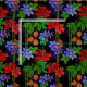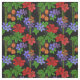 Fettgewebtes gemustertes Material, das die nationale Blume Jamaikas und die ackeligen Früchte über schwarze tropische Blätter darstellt