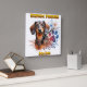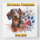 Eine farbenfrohe Abbildung zum Nationalpurebred Dog Day mit einer charmanten Dackel, umgeben von Blumenmotiven und Pfotendrucken.