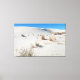 Ein Panoramablick auf den Nationalpark der Weißen Sande in New Mexico, der die weitläufige Weite von weißen Gipsabständen und Dünen zeigt. Die Dünen werden vom Wind geformt und ergeben ein faszinierendes Muster von Wellen und Kurven. Überall in der Landschaft liegen spärliche Pflanze der Wüste, die der sonst trocken weißen Umgebung eine grüne Touch verleihen.