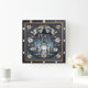 This square wall clock features a highly detailed, dimensional illustration of the Nativity scene centered within an elaborate border. The central motif, set against a dark blue background, shows Mary, Joseph, and the Baby Jesus in the manger, surrounded by other figures. Above them, the text "PEACE ON EARTH" is prominently displayed, flanked by two angels and two white doves. The entire circular scene is framed by a rich blue and gray floral wreath of white lilies and blue berries. The illustration is set within a wide, dark outer wood-look frame, which is simulated using high-detail artwork and is not real wood.