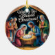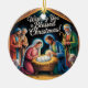 A classic and reverent illustration of the Nativity scene, featuring Mary and Joseph kneeling beside the baby Jesus sleeping in a manger under the Star of Bethlehem. The scene, set inside a stable, is rounded out by the presence of shepherds and small lambs, conveying the traditional Christmas story. The image includes a festive greeting in script reading, "Wishing You a Blessed Christmas!".