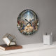 This solemn clock depicts a beautiful Nativity scene, with Mary and Joseph kneeling by the Baby Jesus in the manger, surrounded by shepherds and lambs. The stable is framed by a rustic stone archway, with a bright star and angels shining above. The border is decorated with festive garlands, ornaments, and pine sprigs. The design may look real due to the high detail and three-dimensional texture in the artwork.