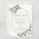 Die schöne Braudusche aus Holz mit grauer Schrift, die von einem geometrischen Imitat mit goldenem Rahmen gerahmt ist, und das üppige Grün der Jäger, das grüne Blattwerk, die Blätter und die weißen Beeren. Eine moderne Wahl in einem natürlichen Farbschema für boho oder naturgetreu gestaltete Brautpartys.