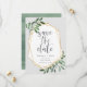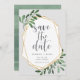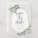 Eine schöne, grüne und goldene Hochzeit bewahrt die Dattelkarten mit grauer Schrift, die von einem Imitat mit geometrischen Rahmen gerahmt ist, und einer dunklen Jäger-grünen Aquarellfoliage, Blätter und weißen Beeren auf einem hellgrauen Hintergrund. Personalisieren Sie Ihre Namen, Ihr Hochzeitstermin und Ihren Standort und fügen Sie zusätzliche Informationen, wie Ihre Hochzeitswebsite, auf der Rückseite ein. Eine moderne Wahl in einem natürlichen Farbschema für Hochzeiten im Boho-, Wald- oder Naturbereich zu jeder Jahreszeit.