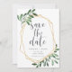 Eine schöne grüne und goldene Hochzeit bewahrt die Dattelkarten mit grauen Buchstaben, gerahmt von einem Imitat goldgeometrischen Rahmen und dunklen Jäger grünen Aquarellfoliage, Blätter und weißen Beeren. Personalisieren Sie Ihre Namen, Ihr Hochzeitstermin und Ihren Standort und fügen Sie zusätzliche Informationen, wie Ihre Hochzeitswebsite, auf der Rückseite ein. Eine moderne Wahl in einem natürlichen Farbschema für Hochzeiten im Boho-, Wald- oder Naturbereich zu jeder Jahreszeit.
