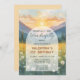 Boho and rustic Christian gender-neutral first birthday design based on psalm 139 "Fearfully and Wonderfully Made" with a watercolor-style landscape with mountains, fir trees, field of dandelion flowers, and a rising sun.