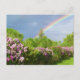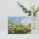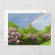 blühende Lavendellilacke inmitten üppiger grüner Bäume mit einem zauberhaften Regenbogen, der über der Oberfläche rasiert