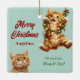An der Vorderseite dieses Holiday-Ornament befindet sich das Bild eines zauberhaften, gelben Tischkätzchens, das beim Spielen mit Verpackungspapier und Band erwischt wurde. Der weiße Text unten steht für "NAUGHTY definieren". Auf der Rückseite ist das zweite Bild des Kätzchens, das an einer Reihe von Baumlichtern hängt, wobei ein anderes Kätzchen nach oben schaut. Der rote Stiltext sagt MERRY CHRISTMAS", mit einem individuelle Name darunter. Ihre Unterschrift ist rechts grün. Niedlich für eine Tochter, Enkelin oder ein Kind, das Lieben hat.