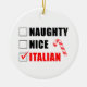 Naughty Nice Italian funny checklist featuring a candy cane. Santa has his own list for Italian people. Hilarious ornament for an Italian household.