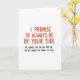 This greeting card has a plain white background and two lines of message-centered text. At the top and center, it says “I PROMISE TO ALWAYS BE BY YOUR SIDE” in large red handwritten-style letters that feel heartfelt and direct. Just below that, a smaller line in black reads, “OR UNDER YOU OR ON TOP OR ON MY KNEES IN FRONT OF YOU,” adding a cheeky twist. The contrast between the big red promise and the smaller black add-on makes the joke land quickly while still feeling affectionate. There are no characters or objects here—just the words—so your attention stays on the message and the relationship behind it. Overall, it’s a flirty, funny Valentine option that’s meant for someone who will laugh and blush at the same time ❤️