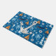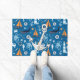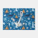 Die nautische Türmatte ist mit einem ozeanblauen Hintergrund mit orangefarbenen Segelbooten, Krabben, Schiffsrädern, Walen, Leuchttürmen, Seestern und einem großen weißen Anker in der Mitte ausgestattet.
