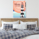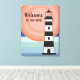 Starke Leinwand mit einem schwarz-weiß gestreiften Leuchtturm im Untergrund von blauen Ober-Streifen und orangefarbenem Sonnenuntergang. Im benutzerdefinierten Text steht "Willkommen auf unserer Zuhause." Kontaktieren Sie mich für Hilfe bei Ihrer Anpassung oder um zusätzliche Matching oder Koordination von Zazzle Produkten anzufordern.