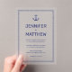 Mit dieser mattierten Acryl-Hochzeitseinladung mit einem marineblau Anker an der Spitze laden Sie Ihre Hochzeitsgäste stilvoll ein. Ihre Hochzeitsdetails finden Sie in modernen Schrift-Schriften, die Sie mit einem dünnen blauen Rahmen personalisieren können. Herzlichen Glückwunsch für Ihre Hochzeit und Ehe! Entworfen von Susan Coffey.