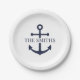 Personalisierte nautische Papiertafel mit marineblau Ankerdesign und Ihrem eigenen Familiennamen in einem klassischen Serif-Schriftart. Ideal für Wiedersehen, Strandfeiern, Party zum Thema Küste und besondere Feste.
